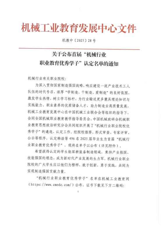 喜讯!我系学子斩获首届机械行业职教优秀学子荣誉!