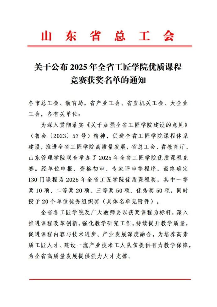 此次活动由由山东省总工会、山东省教育厅、山东管理学院联合主办,2025年,“山东省国防机械电子行业工匠学院”被评为山东省总工会重点支持工匠学院,此次获奖,充分体现了我校工匠学院建设与教学改革的显著成效。《新能源汽车充电技术》课程紧密对接电动汽车充电桩安装检修岗位核心要求,聚焦“充电桩装调检修、充电系统故障排查、充电站运维”三大能力模块,创新构建“桩—车—站”三层递进式教学体系,推动理论与实操深度融合,切实做到“学即能用、训即能战”,精准契合工匠人才“技艺精湛、善解难题”的培养目标。