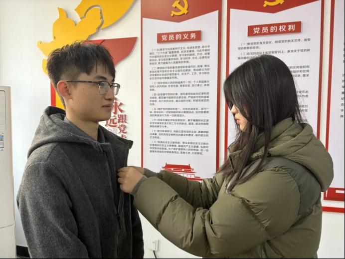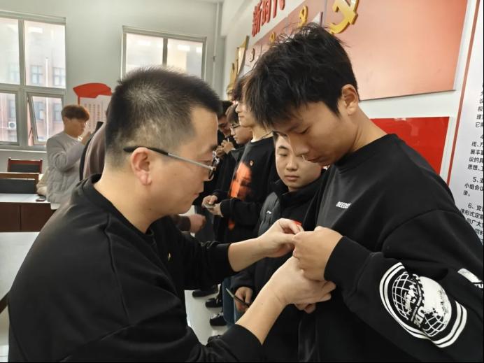 汽车工程系党总支书记逄吉玲、党总支副书记刘一鸣、团总支书记缪丽伟、辅导员代表李其奎,汽车工程系团总支成员为新团员颁发团员证并佩戴团徽。崭新的团徽熠熠生辉,不仅是身份的象征,更承载着团组织的嘱托与期望,定格下青年与信仰同行的珍贵瞬间。